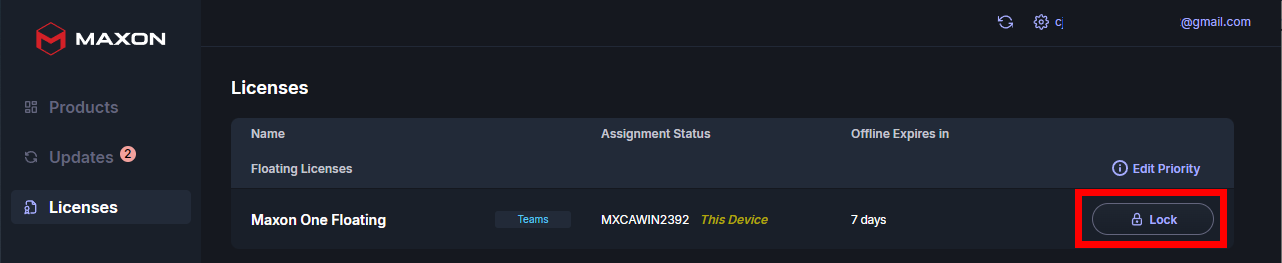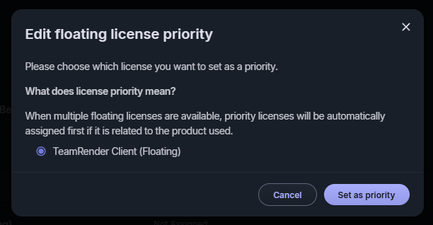 With floating licenses, meaning licenses connected to an organization rather than a specific user, there are no options for Assign and Release. This is because devices with floating licenses perform those functions automatically upon opening their relevant Maxon products. Similarly Maxon App may automatically select one of the floating licenses to have "Priority." Should you want to change this status, click the Edit Priority link. In the resulting pop-up, you will be offered one or more floating licenses; select Set as priority for your chosen license. You should now see that license with a check mark and "Priority" status on its line in the My Licenses tab.