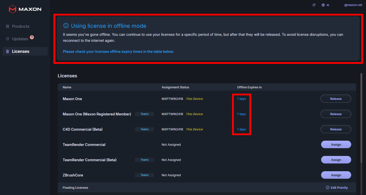 Maxon understands that users often need to take their work on the road. And sometimes, connectivity fails while life (and work) goes on. For such occasions, Maxon allows users to keep their licenses active for up to one week while offline. (The illustration below, based on a beta version, shows 14 days. The true default period for Maxon App is seven days, although admins can change this amount if needed.)