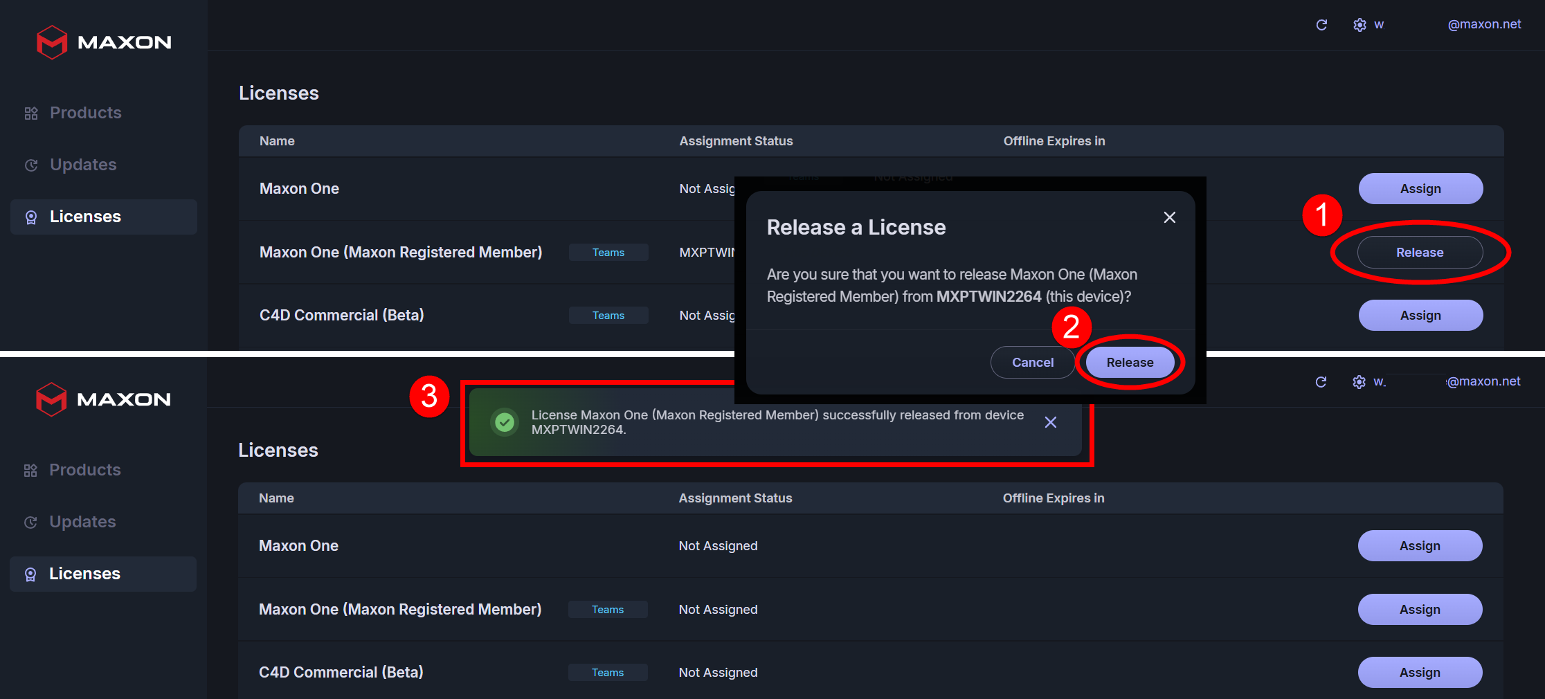 If you have an assigned license (except for trial licenses) that you'd like to release for assigning to a different client, it's literally as easy as 1) click the license's Release button, 2) confirm the release, and 3) check the confirmation message.