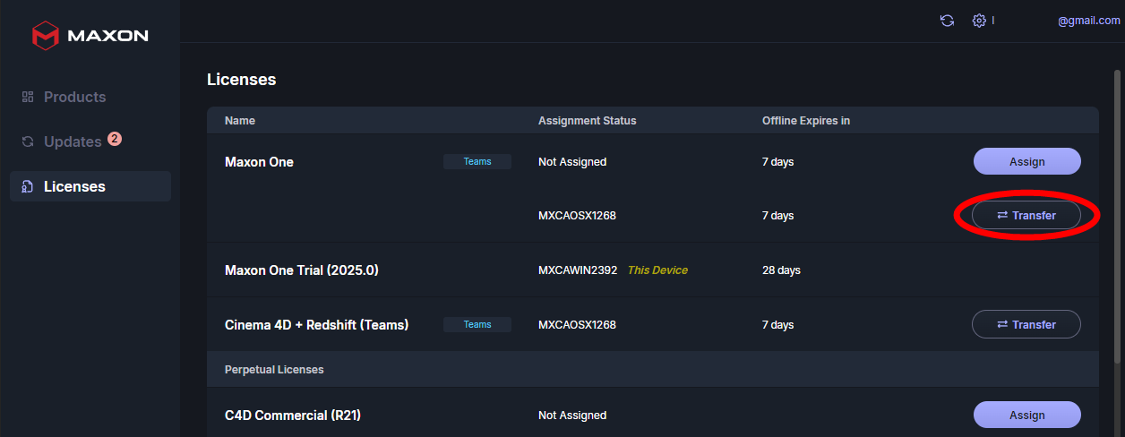 Not least of all, you can transfer licenses between devices. Say you have a desktop and a laptop, and you use Redshift on both. Maxon licensing only allows one instance of a license assigned to a given user or team to run at any given time. However, you can quickly reassign, or transfer, a license from one device to another as needed. If your Redshift license, for example, currently ties to your desktop but you need to run it on your laptop, simply press the Transfer button in the laptop's Maxon App and confirm the switch. Maxon handles all the tracking work on the back end.