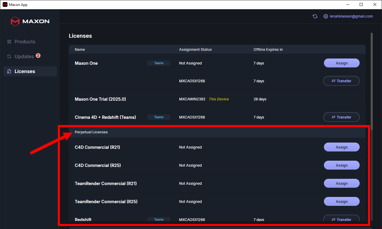 Legacy users may still have a range of perpetual licenses that need to be tracked alongside current subscription licenses. Maxon App displays perpetual licenses in their own dedicated section. Note that perpetual licenses have the same Release and Transfer actions detailed in the Licenses Tab page.