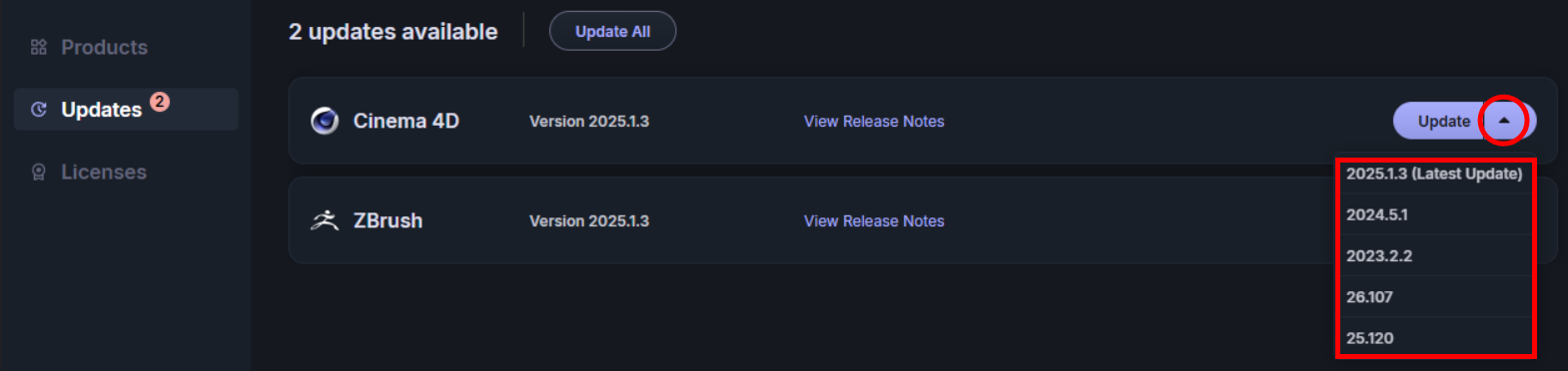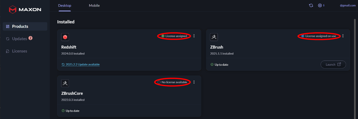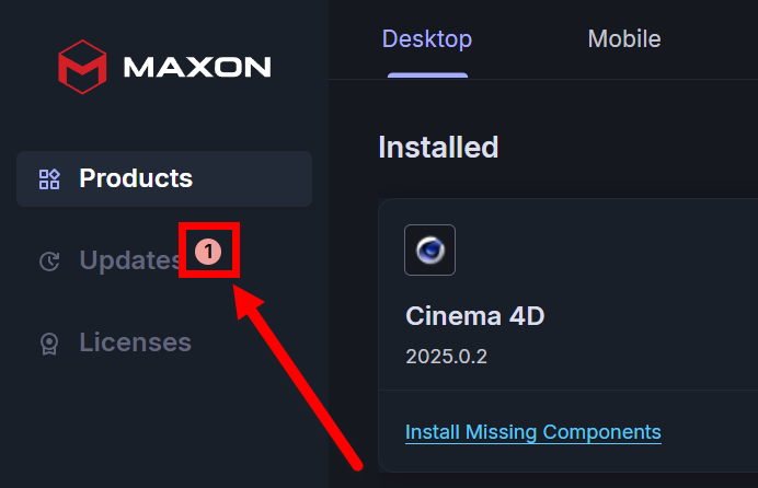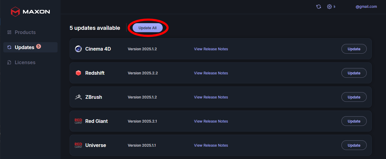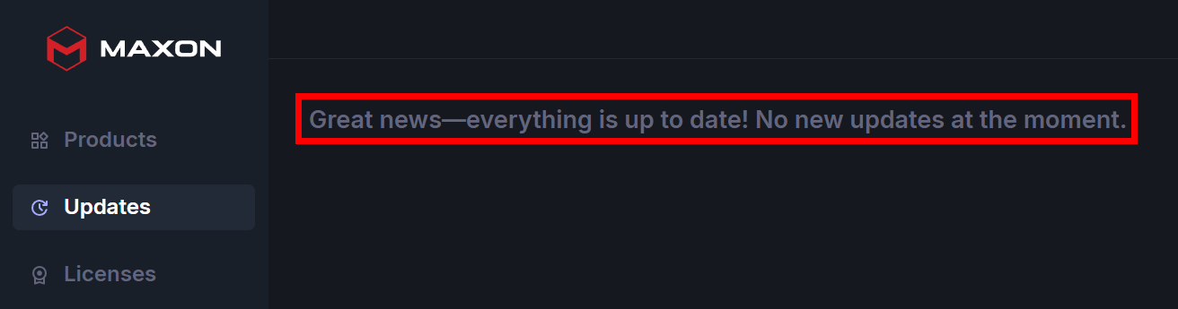On the left side of Maxon App, you’ll find a list of three Maxon product-related tabs: Products, Updates, and My Licenses.