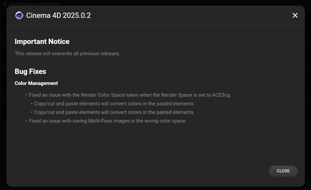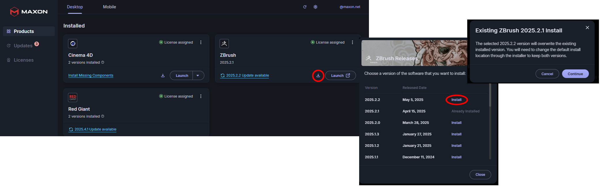 It's possible to initiate a product update while another install for that product is already in progress. (For example, you might be midway through an update when Maxon App discovers that an even newer upgrade version has become available.) A pop-up window will notify you that your request will be queued and may overwrite the install in progress. You can choose whether or not to continue.