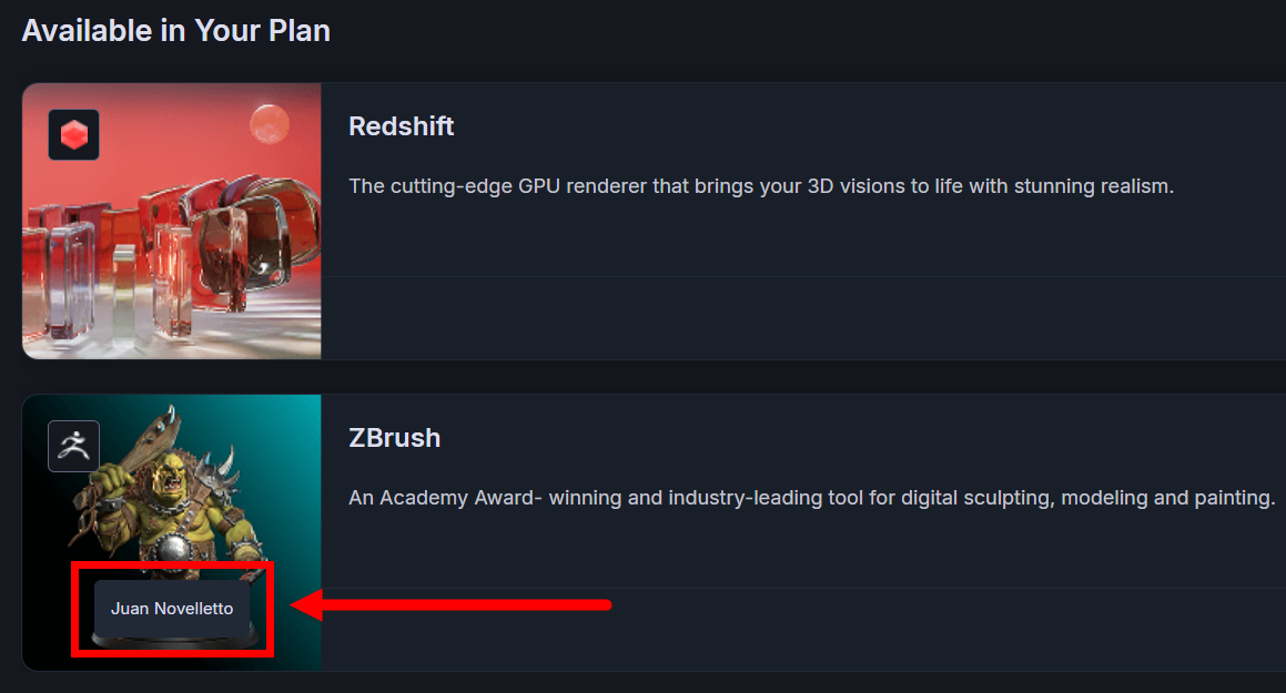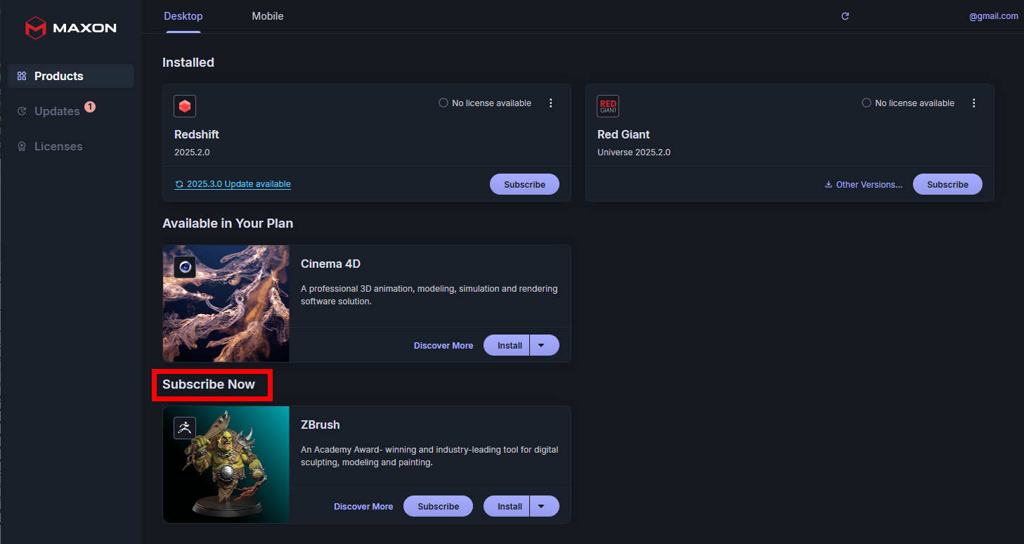 In this user configuration, the account only has a C4D license, although C4D is not installed. Redshift and Red Giant are installed, but the user has no license for them yet, which is why both appear with Subscribe buttons. ZBrush lacks a license and hasn't been installed yet, so the Subscribe and Install buttons both appear on that product card.