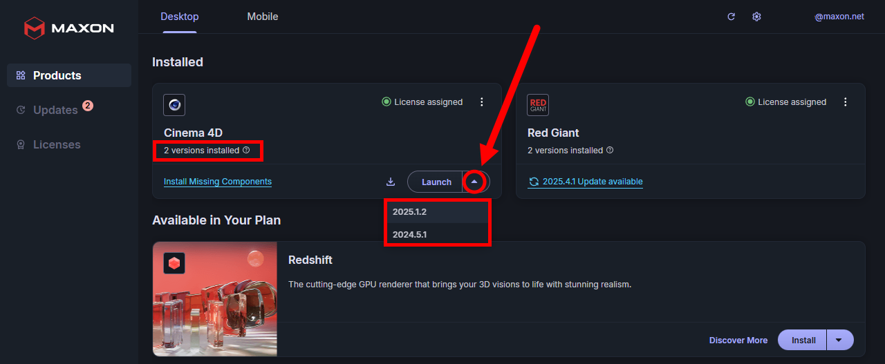 Cinema 4D, Redshift, and ZBrush both support parallel installations, meaning the ability to maintain different versions of the same program in different storage locations. You can see when multiple versions are installed from the x versions installed message located under the program name (shown below).