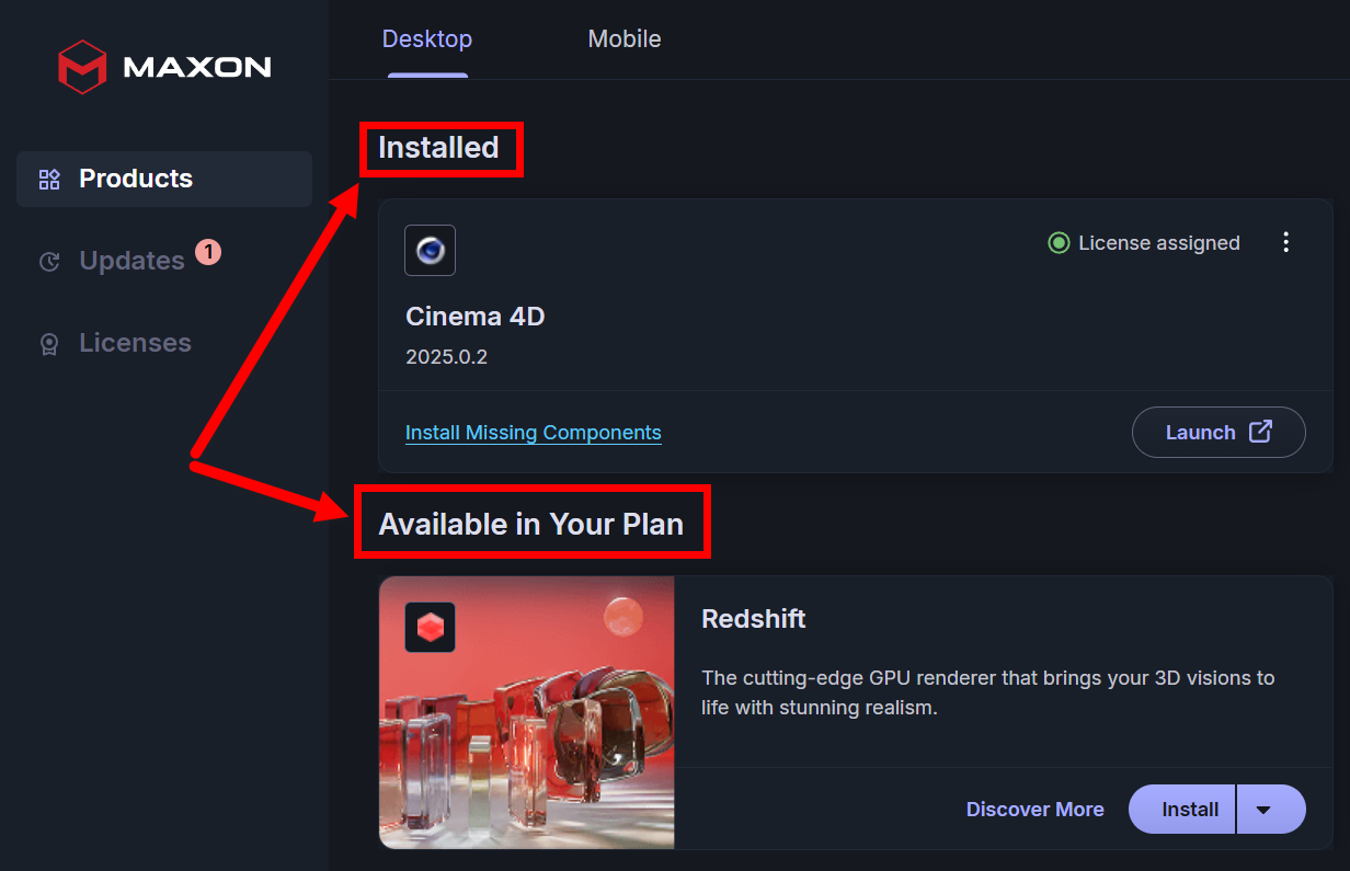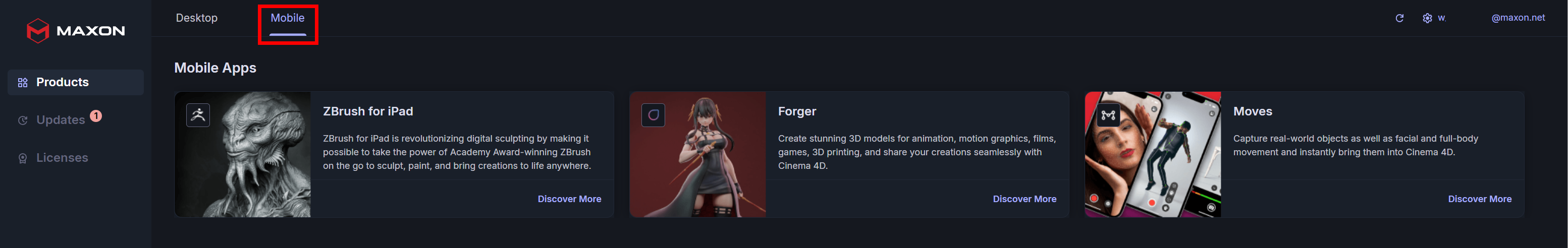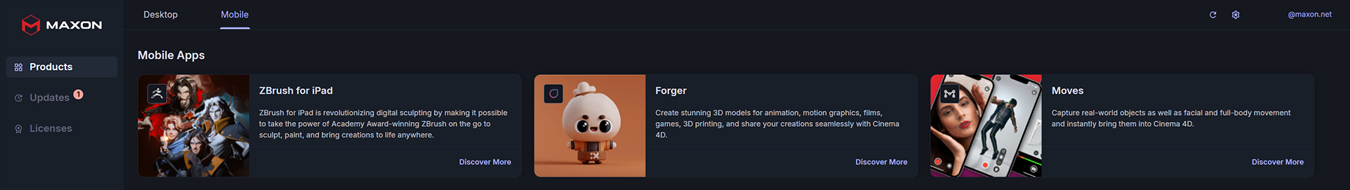 Mobile titles (shown below) are not installable via Maxon App. Rather, they offer a doorway to learn more about the applications while also showing their licensing status. Clicking the Discover More link for each mobile app takes you to their respective product pages.