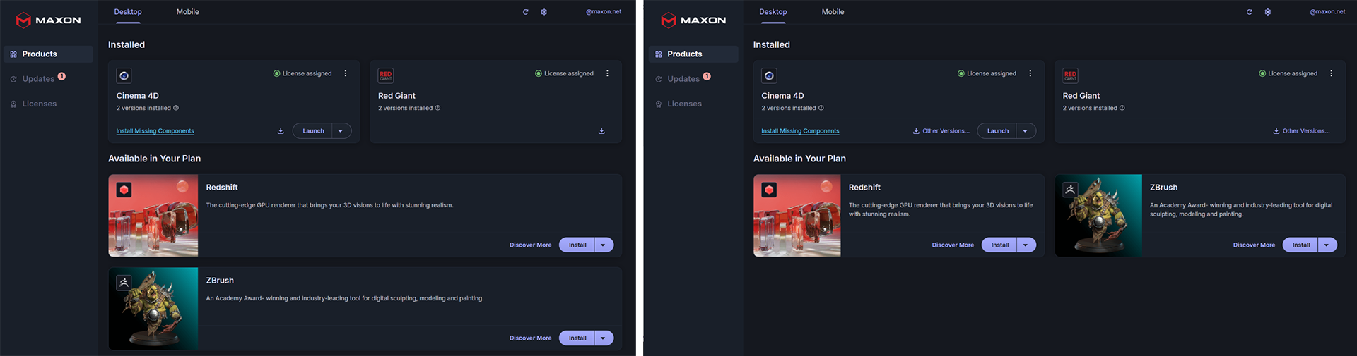 Maxon wants your Maxon App experience to be as intuitive and aesthetically pleasing as possible. Part of that is knowing that user system environments change constantly. You might drag Maxon App from a 13-inch ultralight notebook onto an ultrawide, curved desktop monitor. How Maxon App displays elements at those resolutions can and should adapt to the changing resolution seamlessly. For example, the comparison below shows the same Maxon App layout, except the left image is at its least widest (1280 pixels) and the right is a bit wider (1438 pixels). Notice how the Available in Your Plan cards reformat to better fit the added UI width.