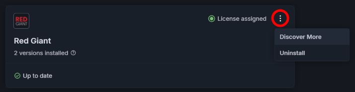 To the right of each license status, find a "three dots" icon (shown above). The Discover More link takes you to that app's product page for more information. Uninstall removes the app from your system.