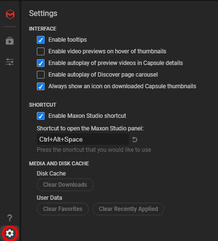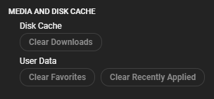 Priorities change with time and projects. You may find yourself someday wishing for a one-click option for wiping out your accumulated Favorites or Downloads. You might even want to clear out Studio knowing which capsules you recently applied, just so you can proceed with a blank slate. For these needs, the Media and Disk Cache section has you covered.