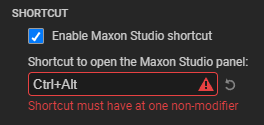 The Settings allow you to enable a “hotkey” combination that activates Studio from within your host app without having to find it in the Window menu. (The same shortcut will also close Studio if it's already open.) As you can see above, Studio will warn you if your combo is either malformed or already taken by another hotkey combo in the host app.