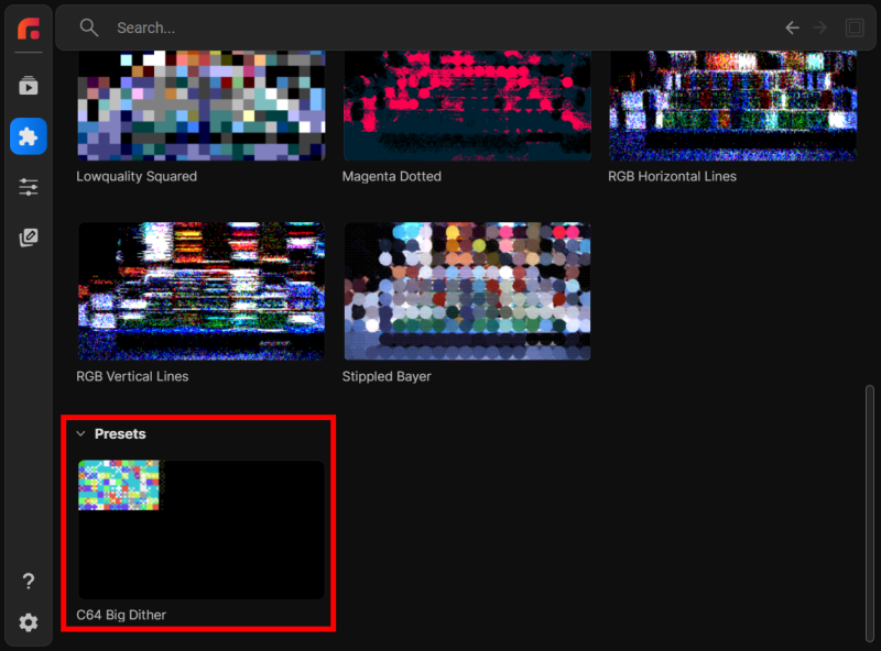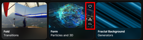 In the example above, you see three icons. The first is the heart used for "favoriting" a plugin. Next is the triangular icon that spawns the full presets gallery for that plugin. And at the bottom waits the Apply Plugin icon. Note that you won't see the presets icon if a given plugin has no presets. -