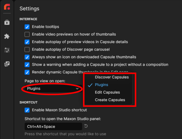 What if you like the Plugins page sooooo much that you want to see it first every time you open Studio? Easy. Click on the gear icon (bottom-left of the UI, under the page tabs) to access Studio's Settings menu. For the Page to view on open: option, select Plugins (or any other page you prefer).