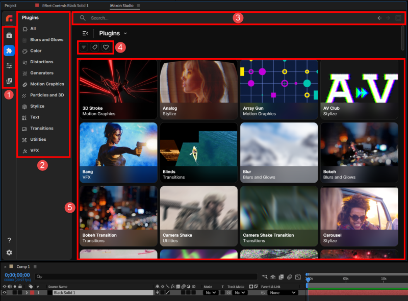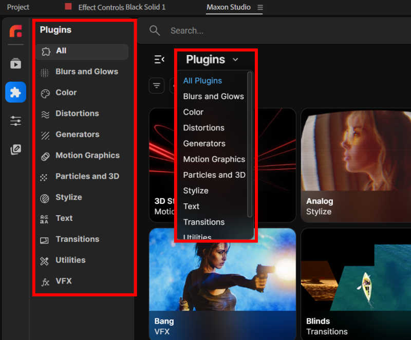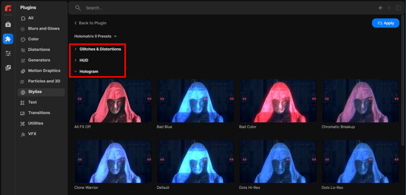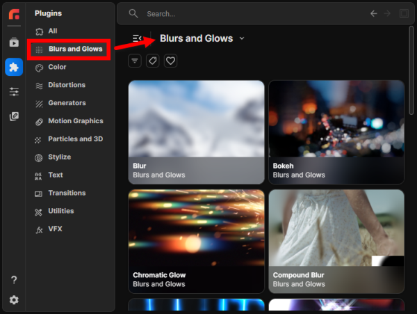 The Plugins page also provides search and filtering, and category navigation. Or you can scroll through the Red Giant effect categories and navigate through the thumbnails. We'll detail this below.