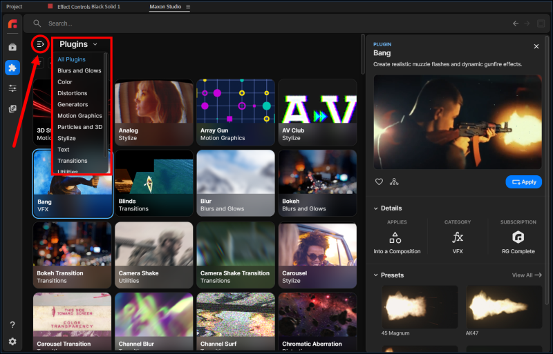 Why would Red Giant do something so seemingly redundant? Because sandwiched between these two menus, you see the little "collapse" icon (pointed out below). Use this to collapse the main Categories menu and free up more space for, say, additional grid columns or the plugin details panel. The second menu then becomes your still-convenient navigation tool without sacrificing prime Studio real estate.