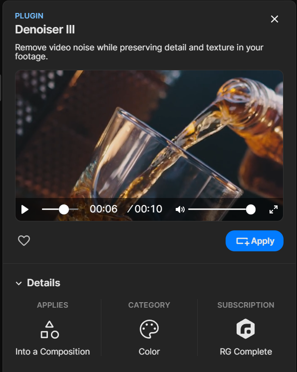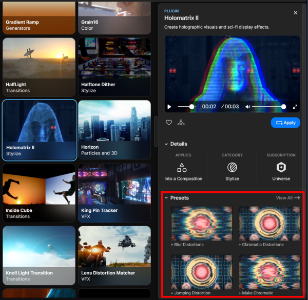 Below the plugin name, find a short description of the plugin's function followed by a short demonstration clip that cycles within an embedded video player. Like what you see? Consider clicking the heart icon to "favorite" it. If your plugin has presets, you'll see a small, triangular icon to the right of the favorites heart. (Find more on presets below.) And if you know the plugin is definitely destined for your comp, go ahead and click the Apply button.