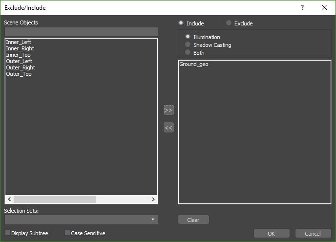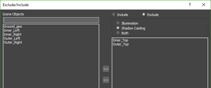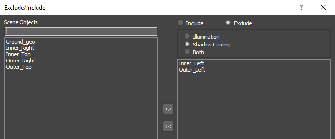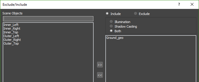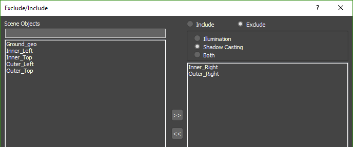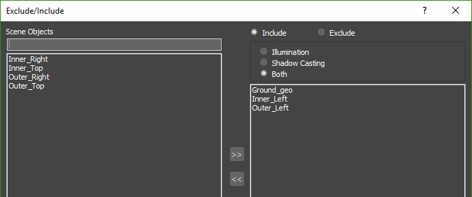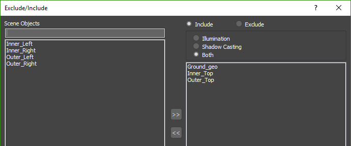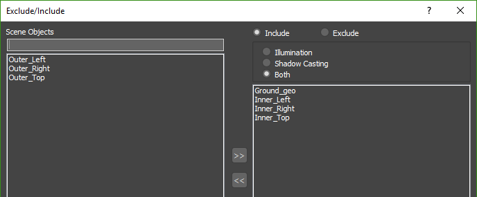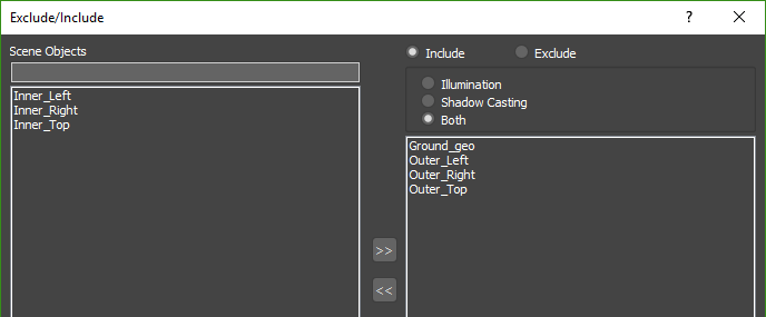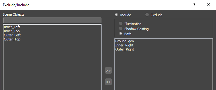 - Both: When using this mode the light will include/exclude objects from both recieving illumination and casting shadows from the light. Any objects not included in the list will be ignored.