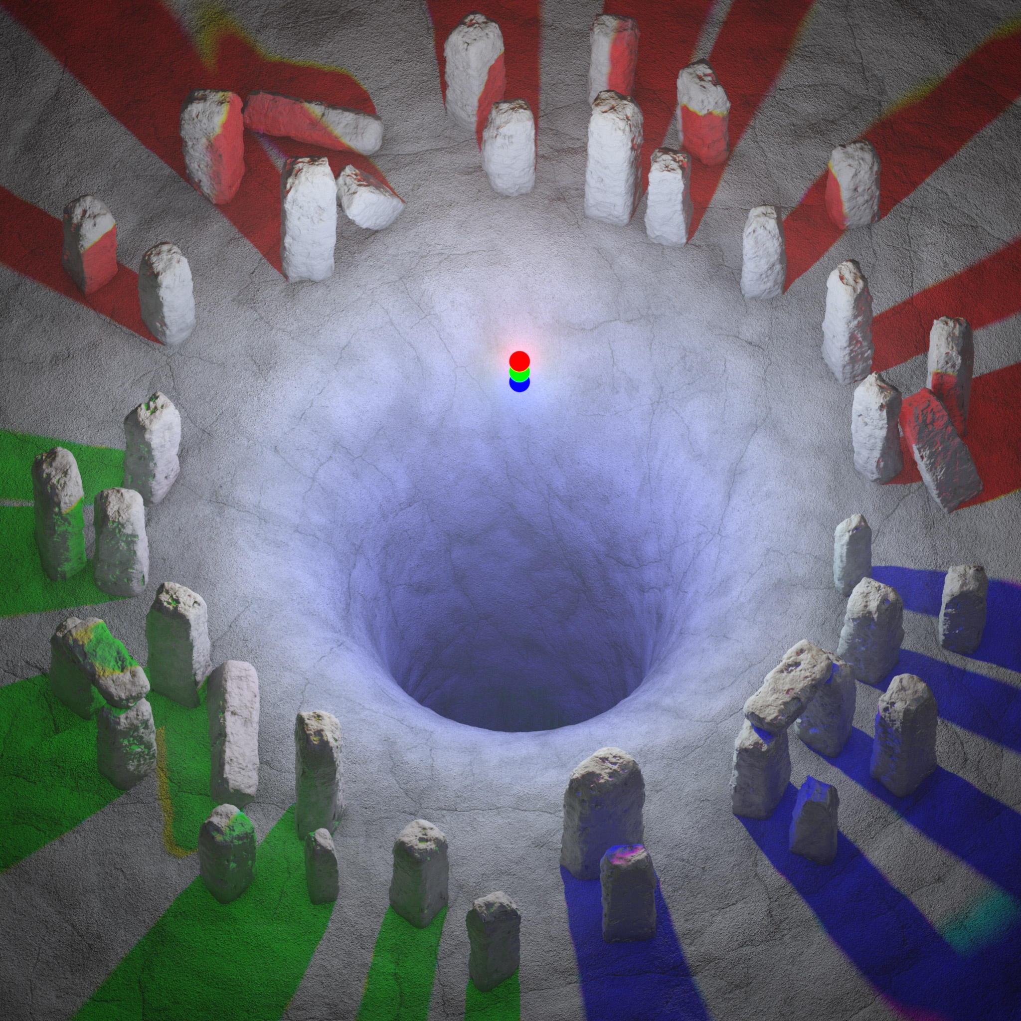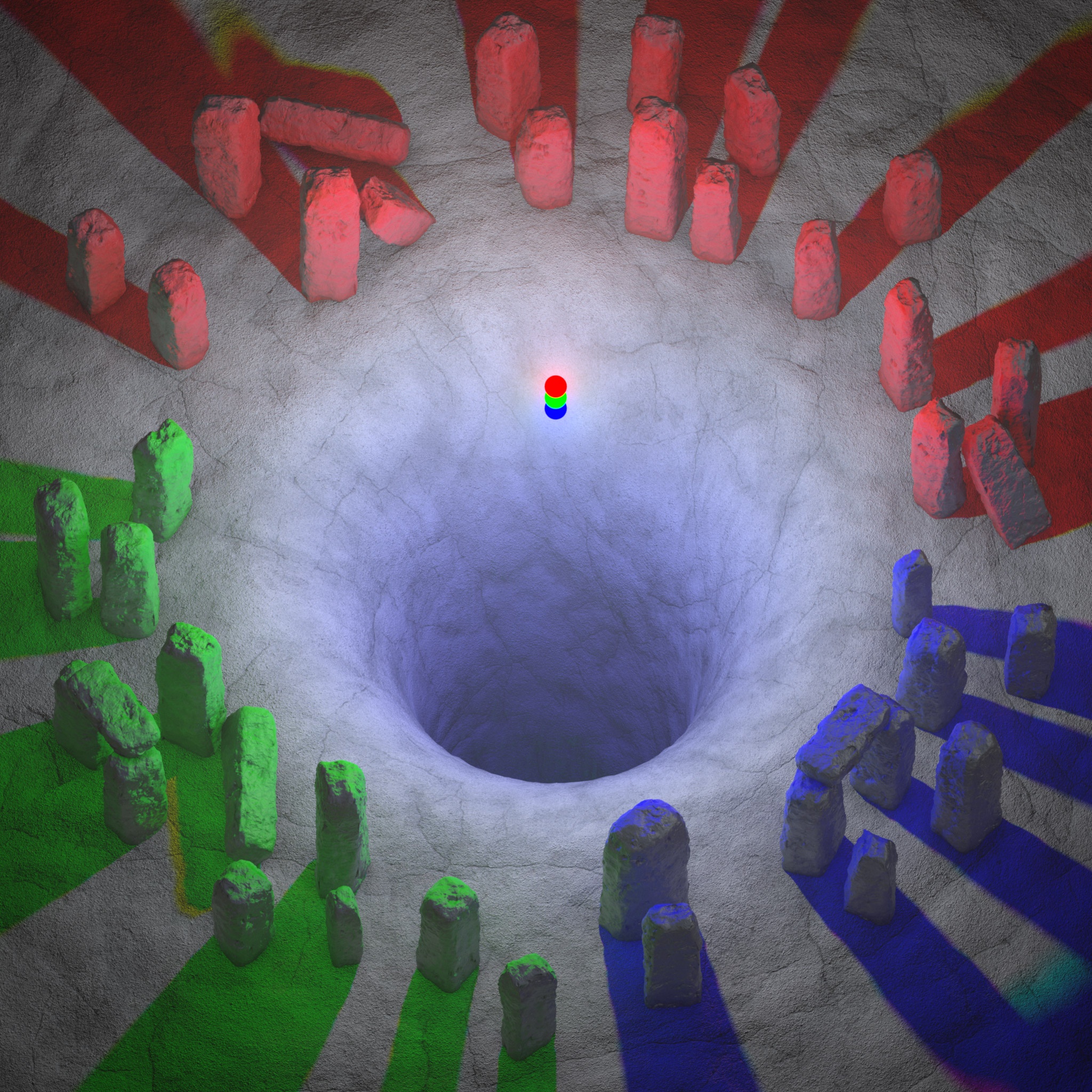 As you can see above, the rocks have been split up into thirds each with their own light exclusively affecting each third. The ground object remains affected by all 3 lights which is why the shadow color of each rock section is the additive result of the remaining lights still casting in this area. For example, the red rocks at the top of the image are receiving light and casting shadows from the red light alone, however, the blue and green lights are still casting light in this shadowed region resulting in cyan colored shadows.
