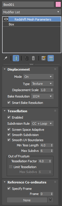 On the other hand, if this value is set too high, there won't be any visual artifacts but performance could suffer because the Displacement Max value also has an impact on tessellation results. Increasing the Displacement Max value is similar to increasing an objects bounding box, the larger an object's bounding box becomes the more likely it is to enter the camera frustum which would trigger tessellation to occur. This might not be necessary as Redshift does not know if the bounding box actually needs to be that large so it will err on the side of caution and tessellate the object. Therefore, it is recommend to use a value that is as low as possible. Unfortunately, due to flexible nature of shaders, it's not currently possible to compute this value automatically. Settings similar to this can be found on other renderers, too, where they might be called "bounds padding" or "min/max bound".