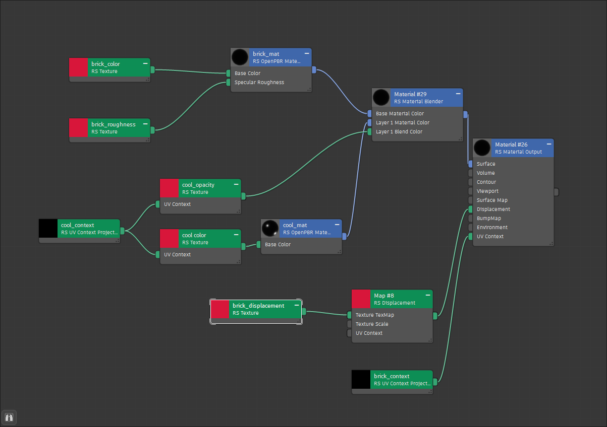 Thanks to downstream connections you don't need to manually sync each texture that should have the same mapping. That's because upstream textures are designed to automatically inherit UV Context information connected downstream in the shading graph. In the examples below, note how changing where the Context Projection node is connected affects which nodes are considered upstream. In the second example, there is no UV Context Projection node downstream from the displacement texture so it is no longer affected.
