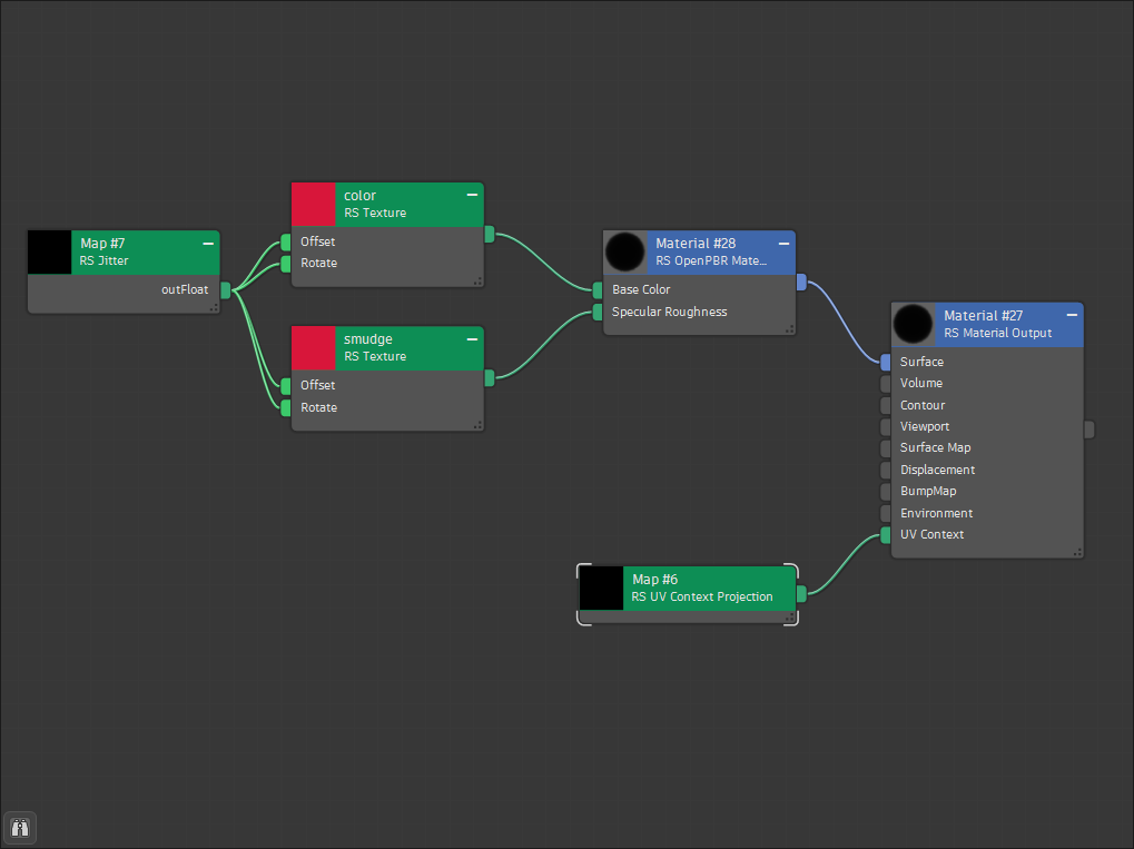 The ports of a UV Context Projection node only allow a constant input, meaning nodes like a texture and jitter cannot drive its parameters. However the UV adjustment options on individual nodes still work in combination with a UV Context connection. This allows you to connect a jitter node to the Offset and Rotate of a texture node to add randomization to your material and still control overall texture placement using the UV Context Projection node.