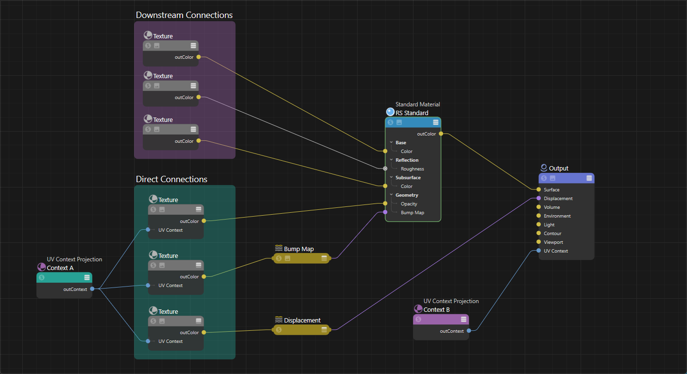 | Direct and Downstream connections UV Context Projection A connected to the Material Output node UV Context Projection B connected directly to three textures, overriding the downstream connection |
