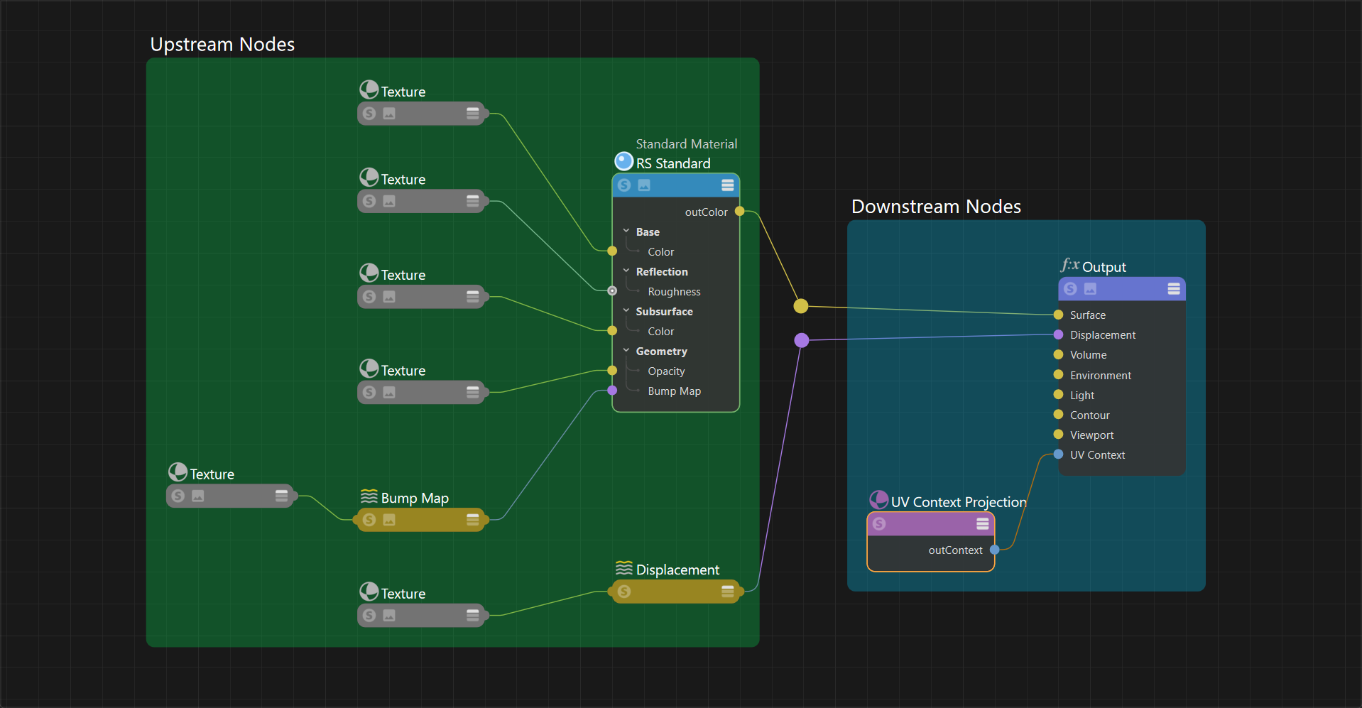 | Downstream connections UV Context Projection connected to the Material Output node All textures connected to the Material and Displacement shaders are upstream |