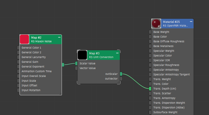 In the example below, a Unit Conversion node is connected to the Transmission Depth with a Maxon Noise used to add variation via the Scalar Value. How that node behaves is dependent on the Mode used.