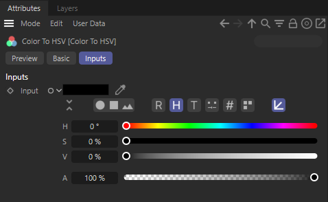 Takes a red, green, blue and alpha color vector and converts it into a hue, saturation, value and alpha output vector. The alpha value is simply copied to the output alpha component.