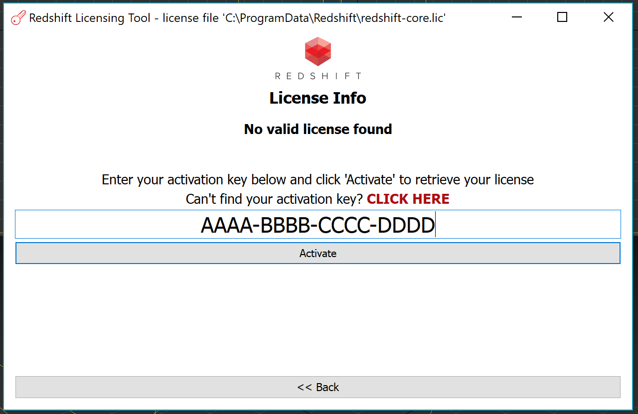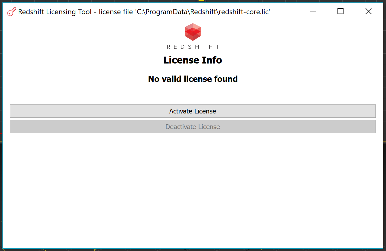 When you run the Redshift Licensing Tool for the first time, you should see a message indicating that no license was found.