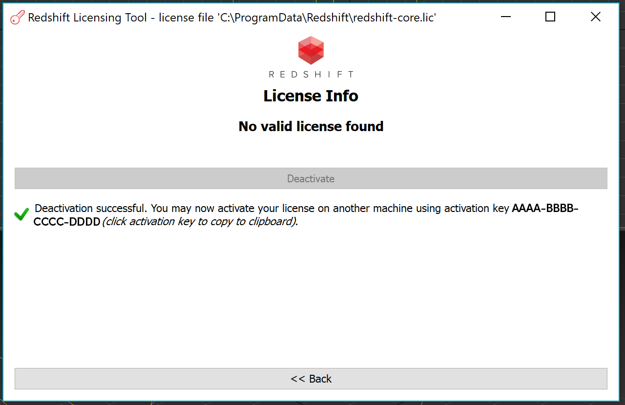 To deactivate your license, simply run the Redshift Licensing Tool and click the Deactivate License button, then follow the on-screen instructions.