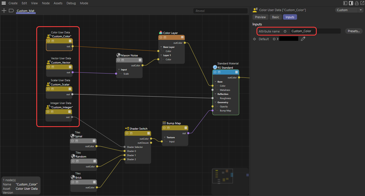 In the shader graph a user data node is created for each attribute and the relevant attribute name is plugged into the "Attribute" field, this pulls the data from the object into the shader graph and uses it to drive the output. For example, the Custom_Color attribute pulls the pink, green, and yellow colors into the User Data Color node and feeds that to the next point in the chain. This works the same for all the types of user data and opens the shader graph up to many possibilities that can be controlled without being inside the actual shader graph once initially set up.