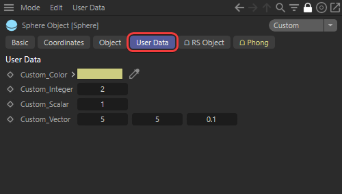 Now it is time to set the actual per-object values, to do this select the object you added these attributes to and navigate to the new User Data tab as pictured below. Each attribute can be changed to provide unique properties when used in a shader graph.