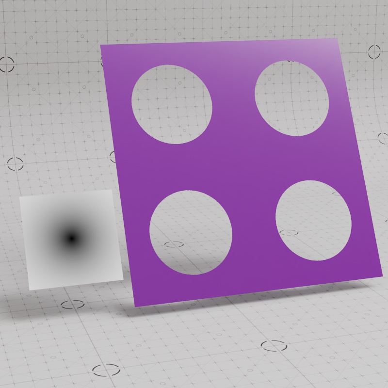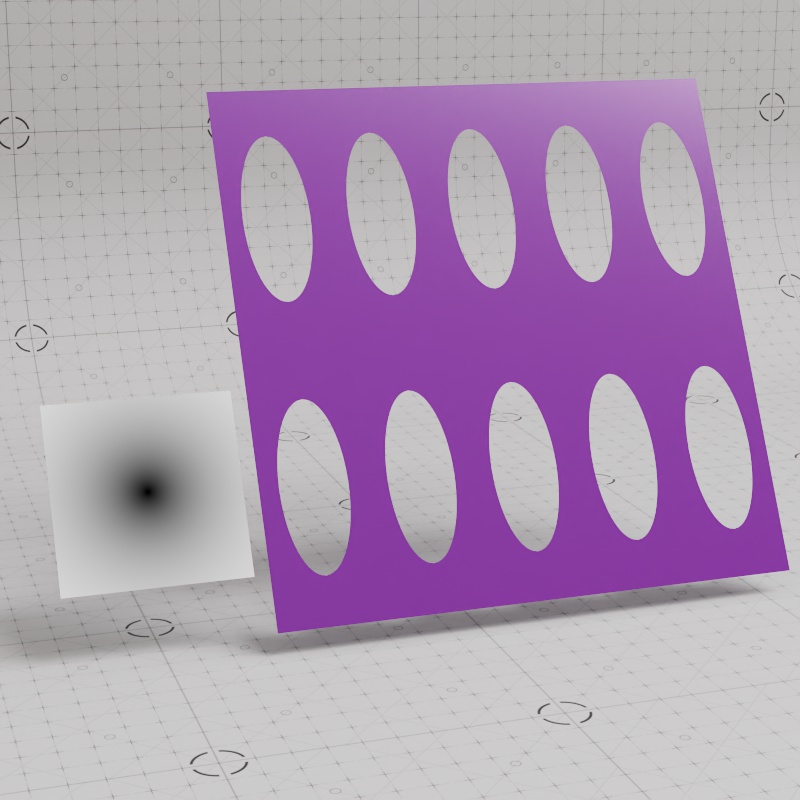 In the examples below the Opacity Threshold is animated from 0 to 1. Lower values only cut out the darker parts of the stencil texture while higher values cut out more. The spiral texture has a black background (0) and three different greyscale lines, one has a value 0.33, the next a value of 0.66, and the last a value of 1. The circular and linear ramps demonstrate a greyscale gradient from 0 to 1. Note how the plane is cutout as the Opacity Threshold is raised above the different brightness levels found in the stencil texture. On textures like the circular and linear ramps the cutoff point smoothly transitions between each value because of the smooth gradient, where as the different sections of the spiral cut out as soon as the Threshold matches the value in each section.