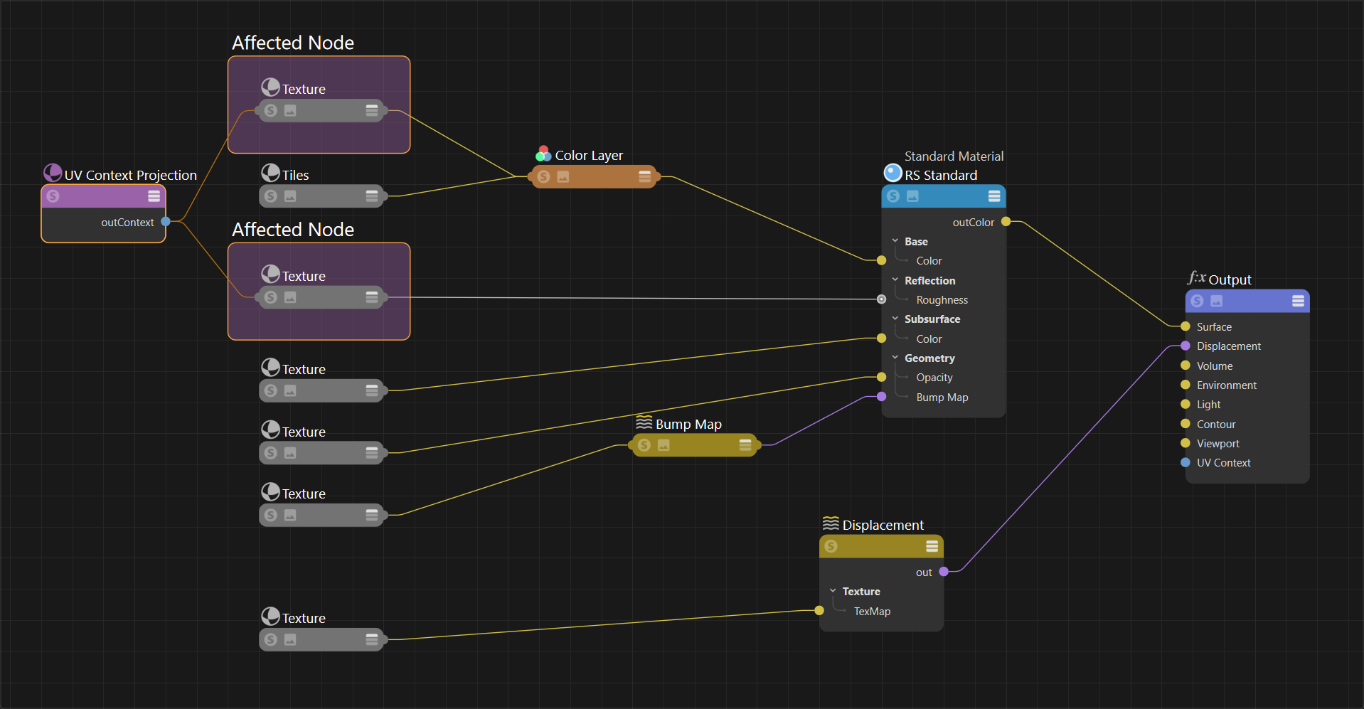 Thanks to downstream connections you don't need to manually sync each texture that should have the same mapping. That's because upstream textures are designed to automatically inherit UV Context information connected downstream in the shading graph. In the examples below, note how changing where the Context Projection node is connected affects which nodes are considered upstream. In the second example, there is no UV Context Projection node downstream from the displacement texture so it is no longer affected.