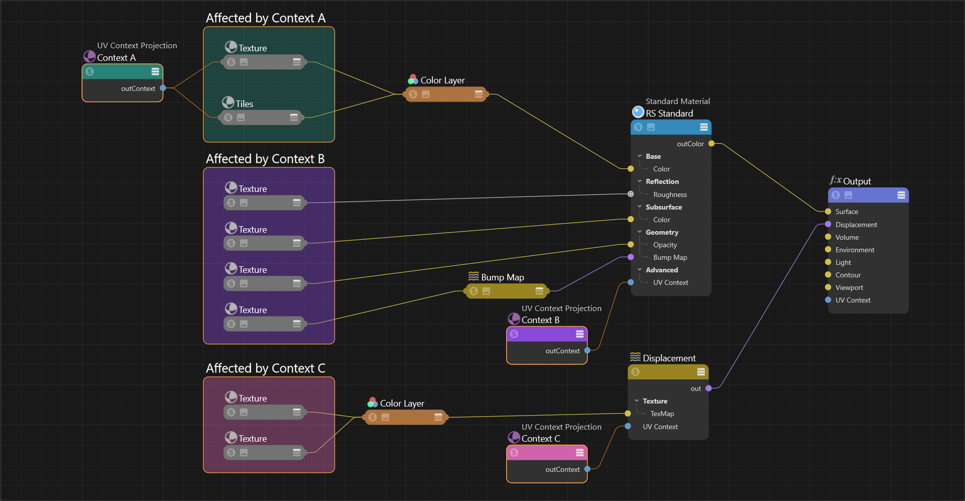 | Direct and Downstream connections UV Context Projection A connected to the Material Output node UV Context Projection B connected directly to three textures, overriding the downstream connection |