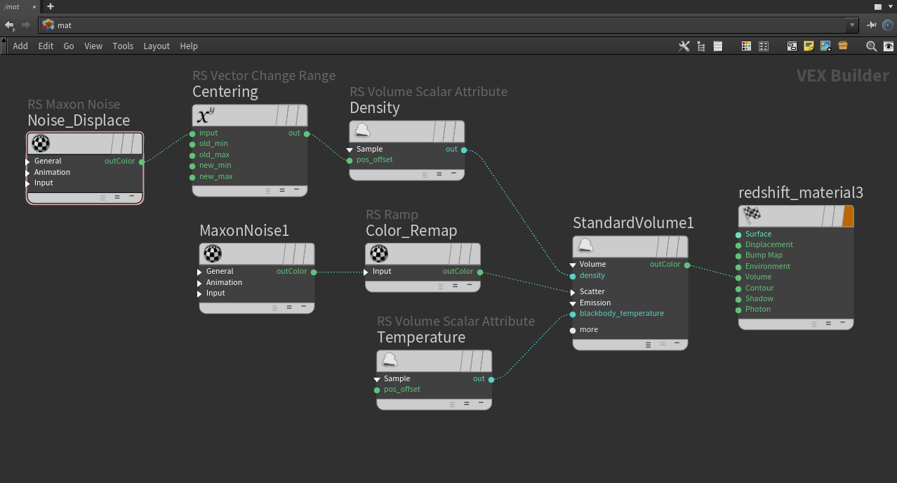 A volume scalar attribute node to load a temperature channel and directly drive the Standard Volume's temperature input. The Output Max is set to 6500 to set the temperature appropriately.