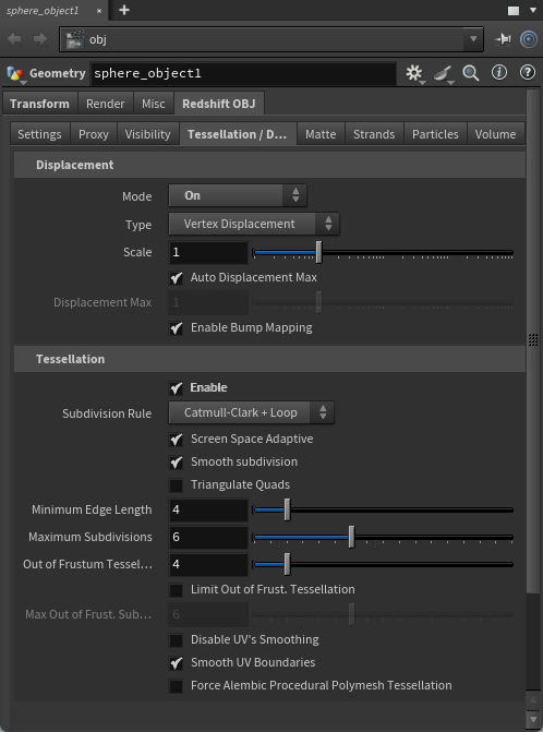 On the other hand, if this value is set too high, there won't be any visual artifacts but performance could suffer because the Displacement Max value also has an impact on tessellation results. Increasing the Displacement Max value is similar to increasing an objects bounding box, the larger an object's bounding box becomes the more likely it is to enter the camera frustum which would trigger tessellation to occur. This might not be necessary as Redshift does not know if the bounding box actually needs to be that large so it will err on the side of caution and tessellate the object. Therefore, it is recommend to use a value that is as low as possible. Unfortunately, due to flexible nature of shaders, it's not currently possible to compute this value automatically. Settings similar to this can be found on other renderers, too, where they might be called "bounds padding" or "min/max bound".