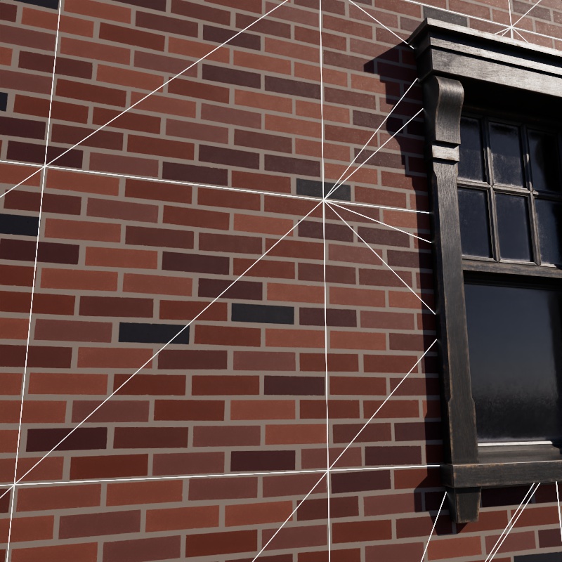 In the example below, the low polygon flat wall uses a brick texture to add high quality Texture Displacement.
