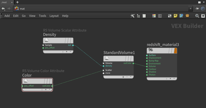The Volume Color Attribute is a shading node that allows for programmable volume shading when used with a Standard Volume shader. For example, a color VDB grid can be loaded and it can be displaced with a noise shader. This can be used for many creative effects and adding color detail to low resolution volumes.