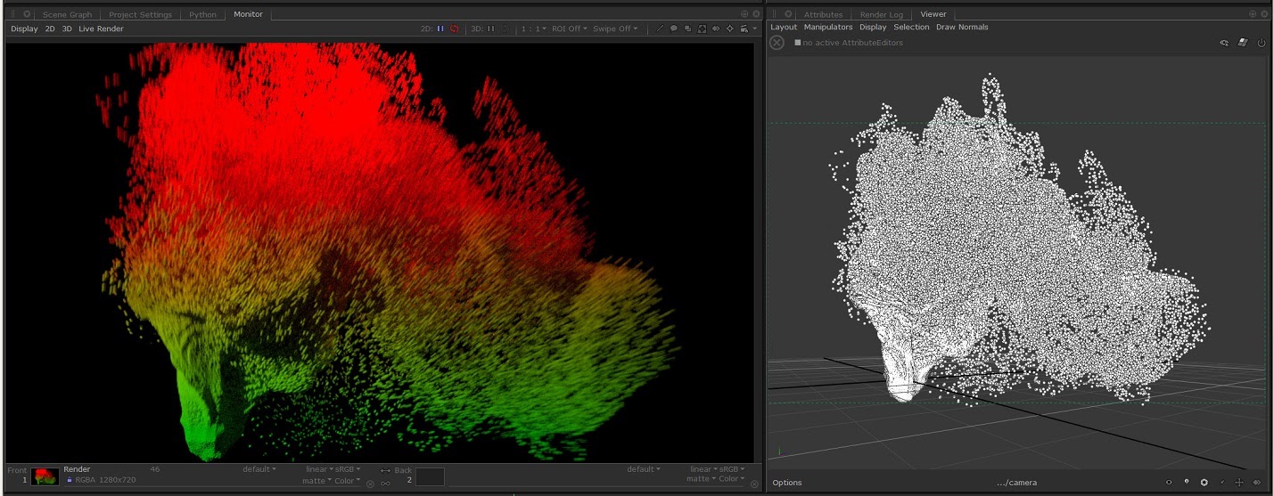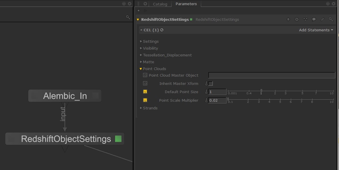 The point clouds are going to be rendered as sphere primitives if the “Point Cloud Master Object” parameter is leave empty in the RedshiftObjectSettings node. Using this node it is possible also configure the point cloud visibility or matte settings. Redshift supports the rendering of large amounts of sphere particles, only limited by the available CPU RAM.