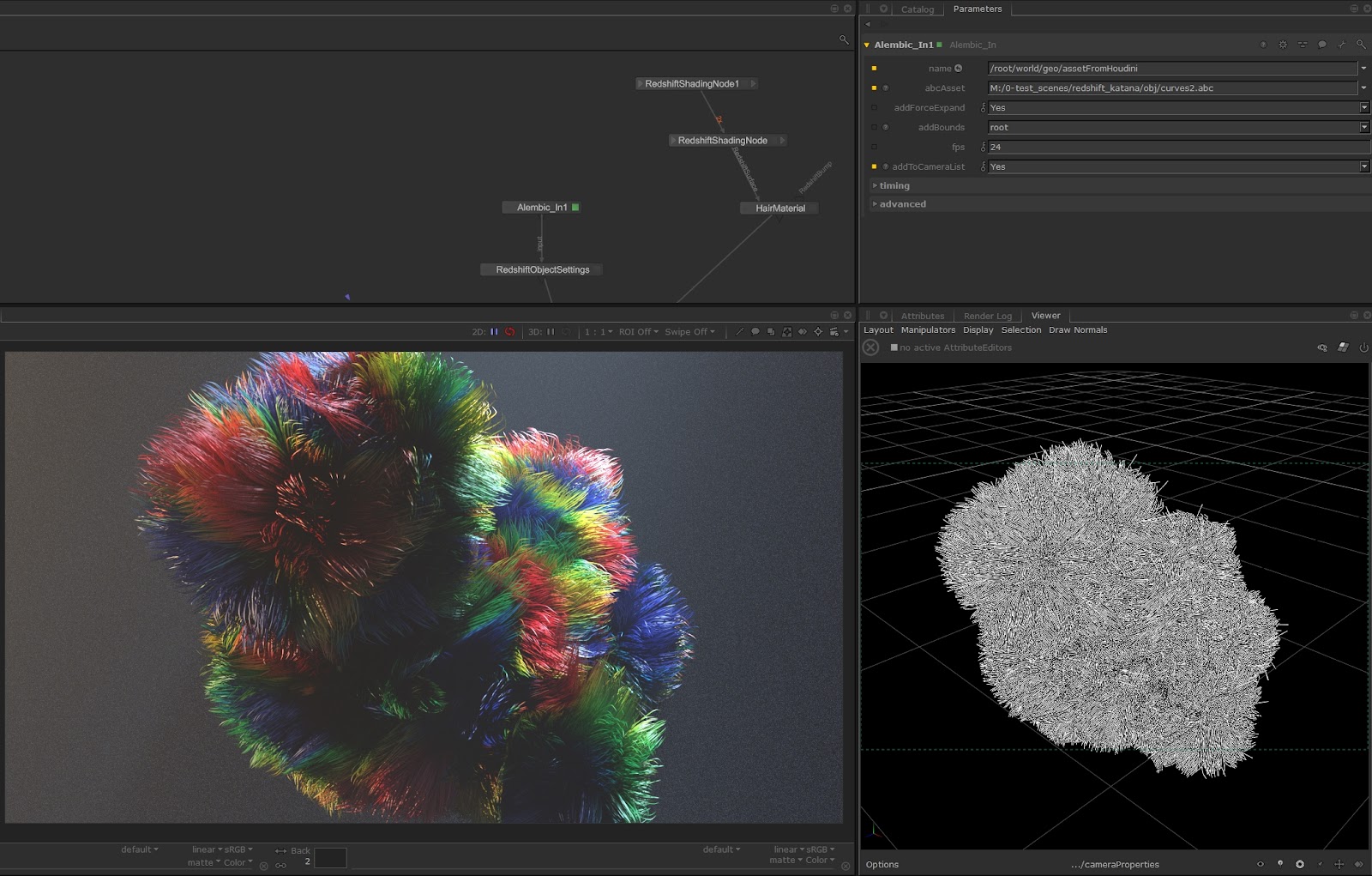 The Redshift for Katana plugin supports the extraction of the curves type locations, including specific information like curve “ width” attribute at point level, arbitrary data at primitive level or multiple UV maps. The curves are translated to RSMeshHair objects, that can manage large amount of curve primitives efficiently. The curves objects support all the Redshift object level features, that can be configured using the RedshiftObjectSettings node.