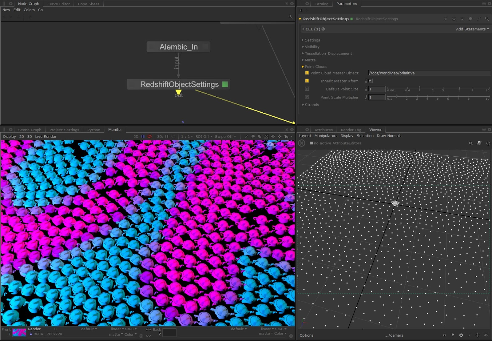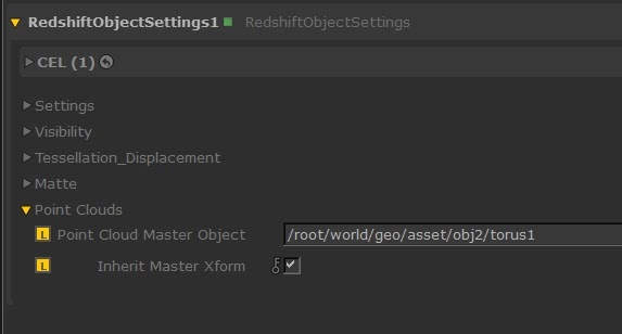 The Redshift point clouds can also work instancing a master mesh object. The parameters related to the object to be instanced are also included in the RedshiftObjectSettings node.
