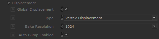 The Auto Bump Mapping option can be used to get around this by essentially using the displacement texture map to automatically drive bump mapping for increased detail. When using Vertex Displacement it may be possible to use less tessellation to achieve the same level of visual quality, or a lower Bake Resolution when using Texture Displacement.
