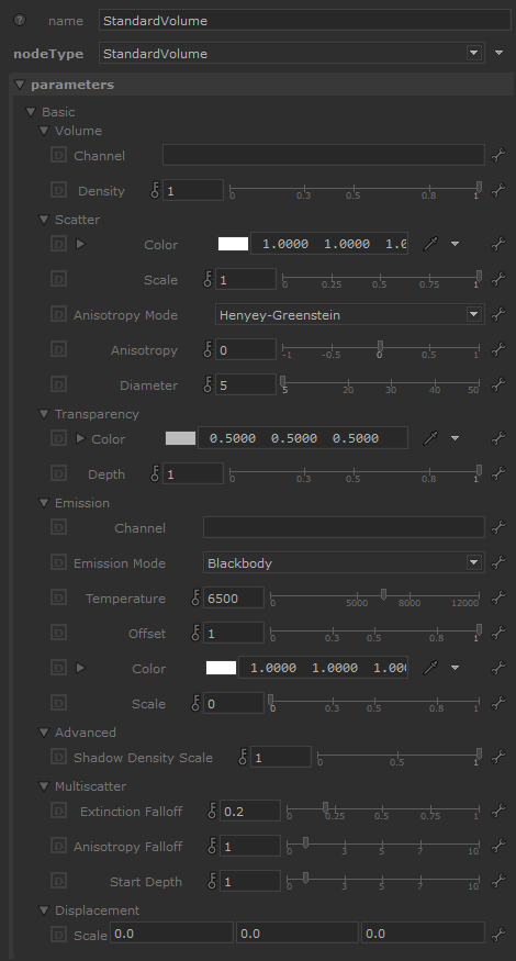 The Standard Volume shader is a physically based shader designed to render heterogeneous volumes like clouds, smoke, fire, and explosions. It combines an easy to use interface and controls while enabling greater flexibility and artistic control with the introduction of programmable volume shading. The Standard Volume shader accepts external shader inputs allowing for the creation and control of procedural volumes or the modification and displacement of existing volume grids.