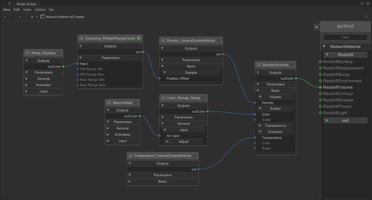 A volume scalar attribute node to load a temperature channel and directly drive the Standard Volume's temperature input. The Output Max is set to 6500 to set the temperature appropriately.