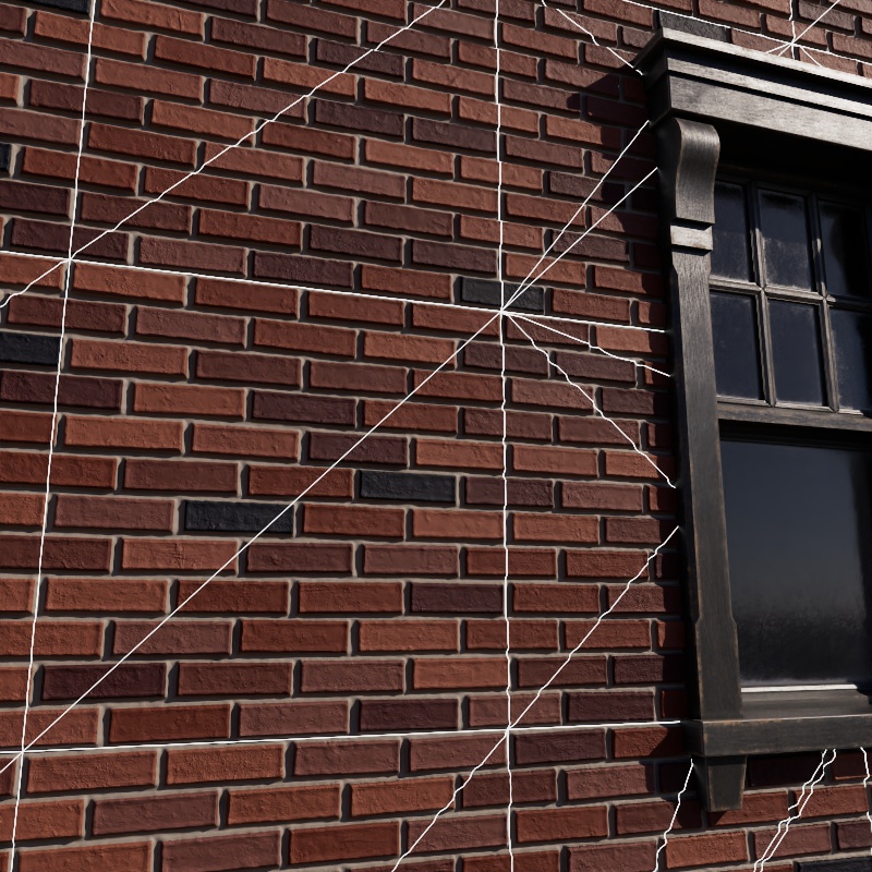 In the example below, the low polygon flat wall uses a brick texture to add high quality Texture Displacement.