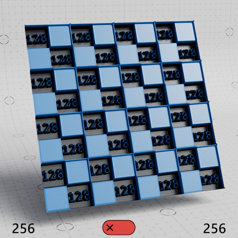 Take this example with a 256x256 checkerboard texture, each square in the texture is 128x128 pixels. First let's look at a baseline where Smart Bake makes no difference, a 1x1 tile of the texture. In the example images below, the number in the bottom left shows the actual "Bake Resolution" while the number in the bottom right shows the effective bake resolution after taking into account how many times the baked texture is tiled when Smart Bake is enabled. In this first example, both examples look the same because the texture isn't being tiled at all so Smart Bake makes no difference.