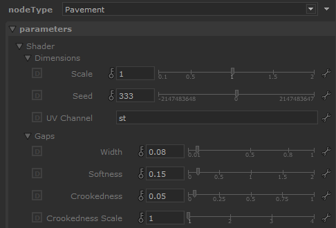 The pavement shader is a procedurally driven texture that can be used to generate fine detail for surfaces like cracked pavement, flagstone mosaic patterns and more. By default it is set up to create a desert-like cracked and stoney surface. Artists can randomize the color of each stone with a gradient, and adjust the size, color and crookedness of gaps.