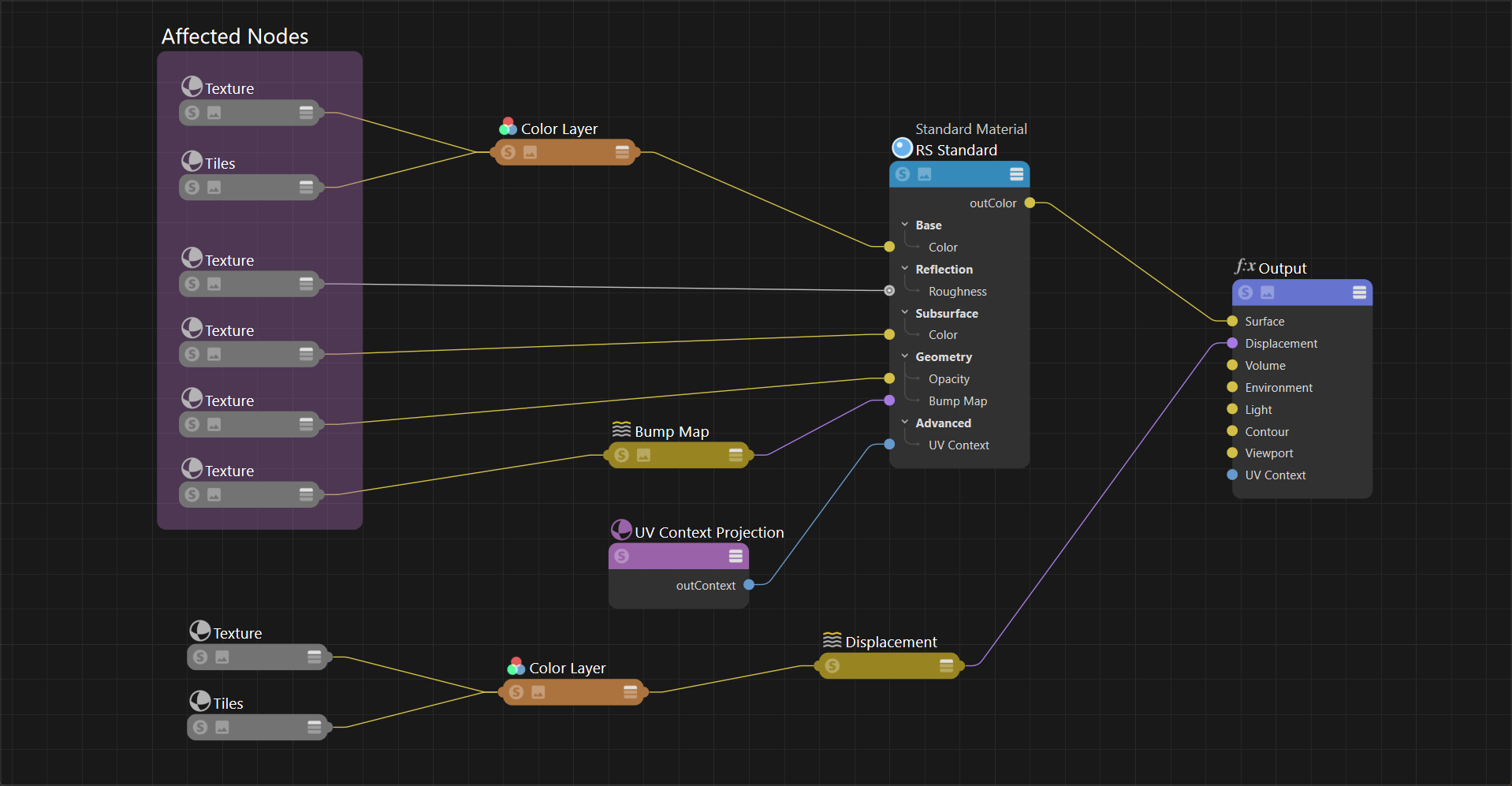 Thanks to downstream connections you don't need to manually sync each texture that should have the same mapping. That's because upstream textures are designed to automatically inherit UV Context information connected downstream in the shading graph. In the examples below, note how changing where the Context Projection node is connected affects which nodes are considered upstream. In the second example, there is no UV Context Projection node downstream from the displacement texture so it is no longer affected.