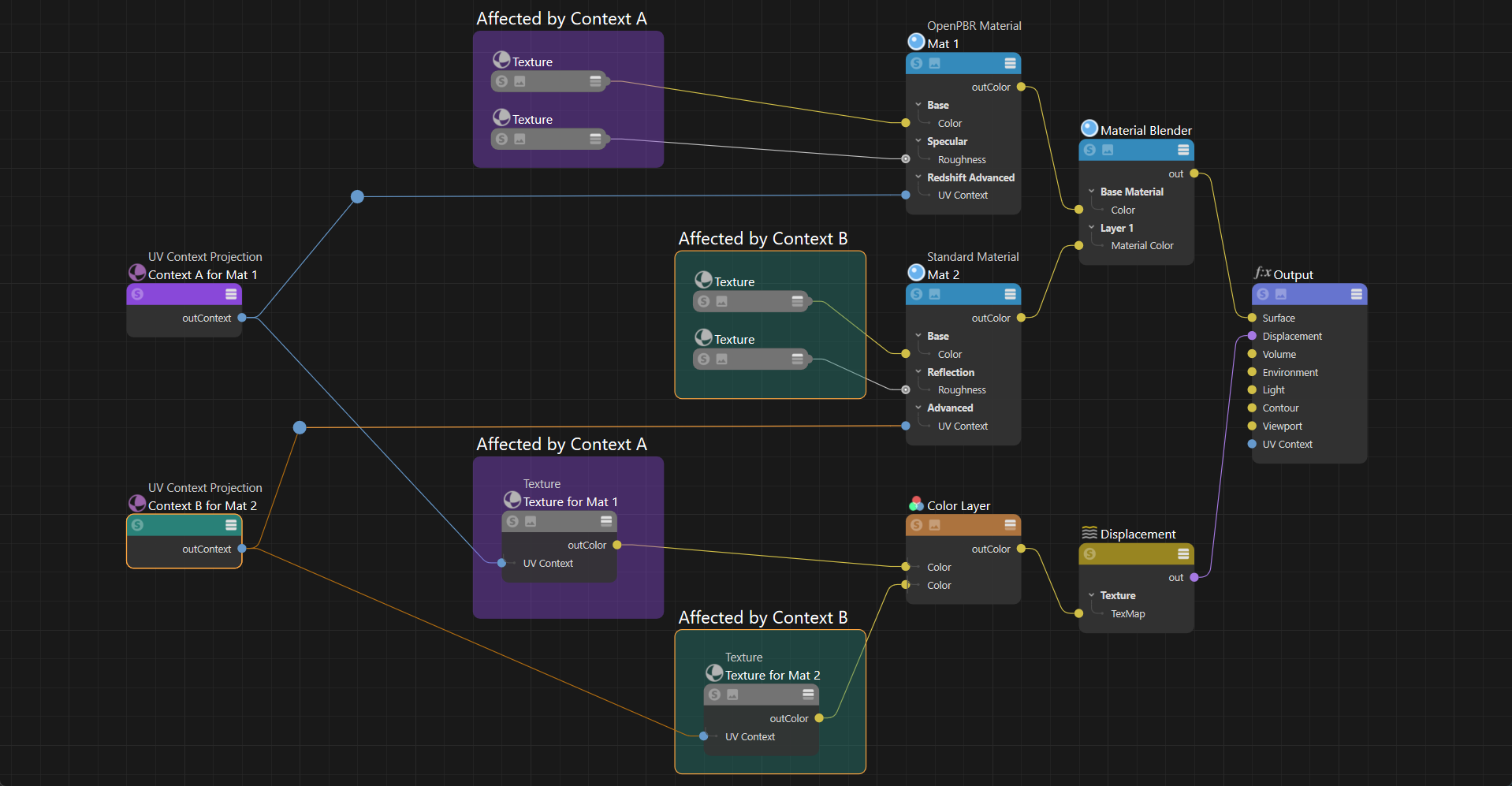 When blending multiple materials, consider using a single UV Context Projection node for each material. In the example below, Context A is used for Material 1 and Context B is used for Material 2. Since displacement textures don't connect to the material directly you can connect the Context nodes directly to the textures to keep them in sync with their material.